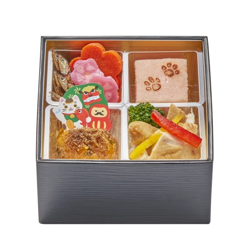 犬とネコのおやつ・ごはん研究家Deco監修のネコちゃん向けおせちです。ネコちゃんが好む田作りや、スモークの香りが食欲をそそるスモークチキン、肉球の焼き印がかわいいしんじょうに、デザートのかぼちゃきんとんには魚粉をふりかけました。別添のあごだし風味ジュレは、料理にトッピングして嗜好性アップを狙ったもの。小食のネコちゃんは、食べる分だけ解凍して与えてください。飼い主さんも楽しめるコミュニケーションフードです。