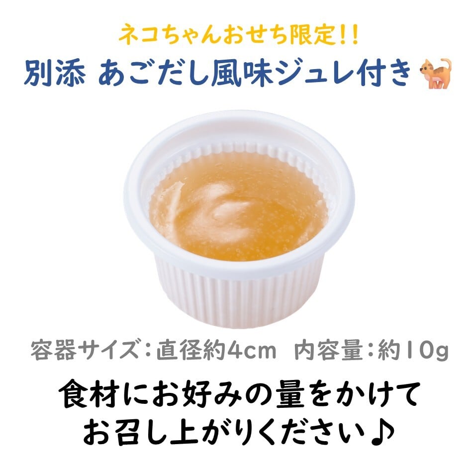 犬とネコのおやつ・ごはん研究家Deco監修のネコちゃん向けおせちです。ネコちゃんが好む田作りや、スモークの香りが食欲をそそるスモークチキン、肉球の焼き印がかわいいしんじょうに、デザートのかぼちゃきんとんには魚粉をふりかけました。別添のあごだし風味ジュレは、料理にトッピングして嗜好性アップを狙ったもの。小食のネコちゃんは、食べる分だけ解凍して与えてください。飼い主さんも楽しめるコミュニケーションフードです。