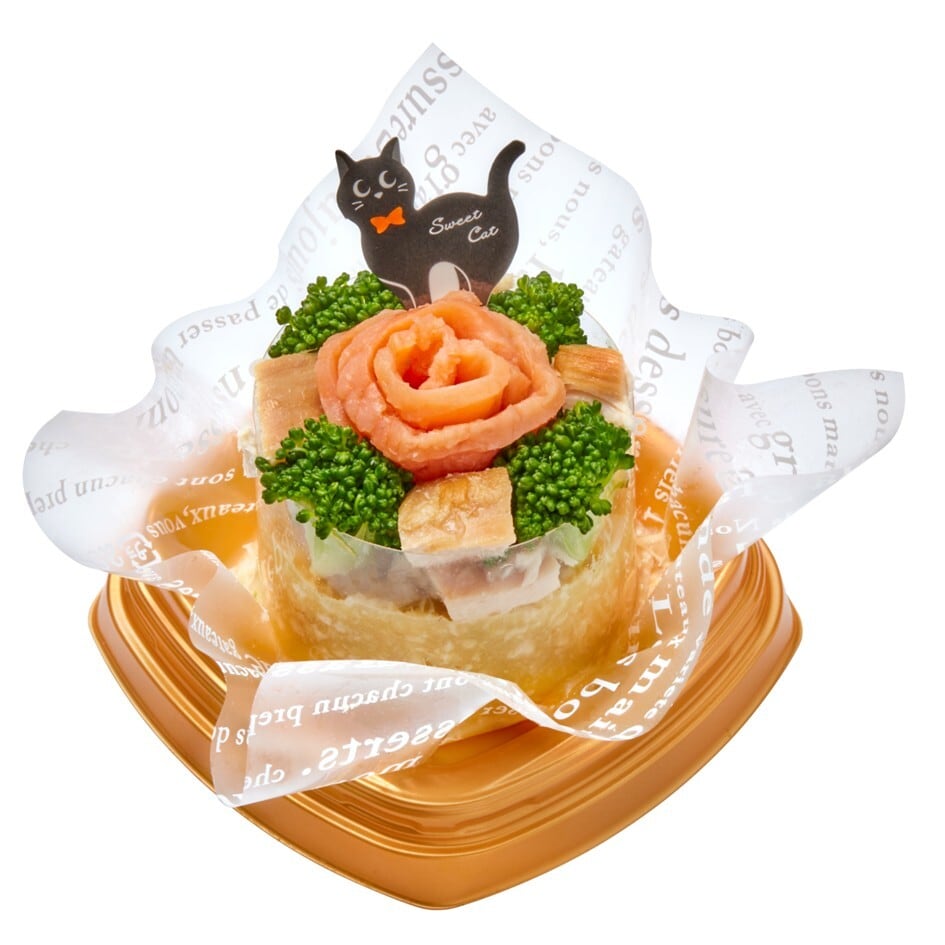 人気のスイートポテトを土台に、薔薇のように巻いたスモークサーモンと嗜好性抜群のスモークチキン、ブロッコリーでデコレーション。オリジナルピックを添えて、見た目にも華やかな仕上がりになりました。飼い主さんも楽しめるコミュニケーションフードです。