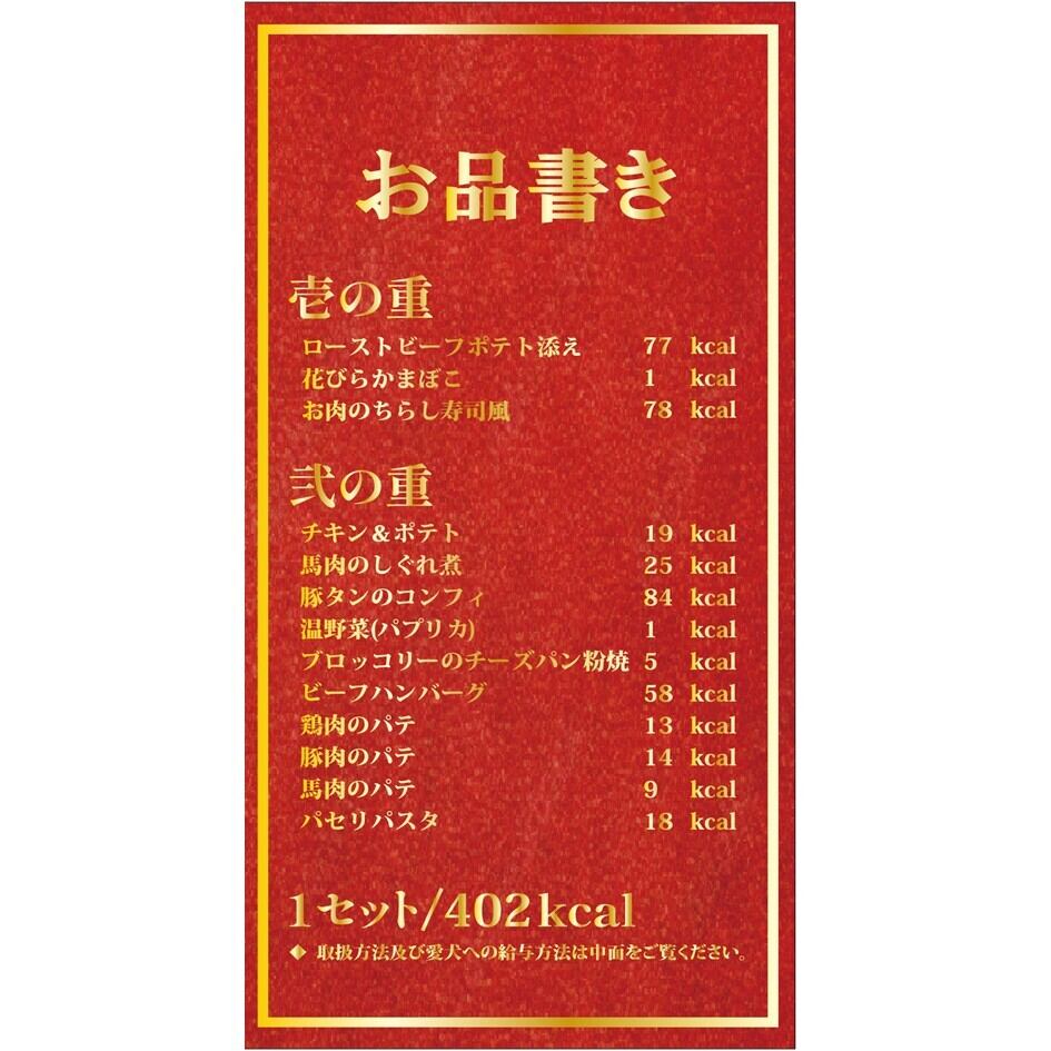 犬とネコのおやつ・ごはん研究家Deco監修の、ワンちゃんの大好物、お肉の洋風料理をお重に詰めた二段重の特選おせちです。一の段には人気のローストビーフ、牛肉を乗せたお肉のちらし寿司風を。二の段には豚タンのコンフィ、馬肉のしぐれ煮、チキン&ポテトや、ビーフハンバーグ、鶏肉・豚肉・馬肉を使ったパテなど、嗜好性の高いお肉料理を厳選しました。