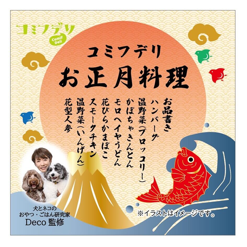 毎年好評のお正月料理。定番のハンバーグや、コミフデリで人気のスモークチキン、彩りにかぼちゃきんとんや緑色が鮮やかなモロヘイヤうどん、花びらかまぼこを揃えた8品のお正月料理です。飼い主さんも楽しめるコミュニケーションフードです。